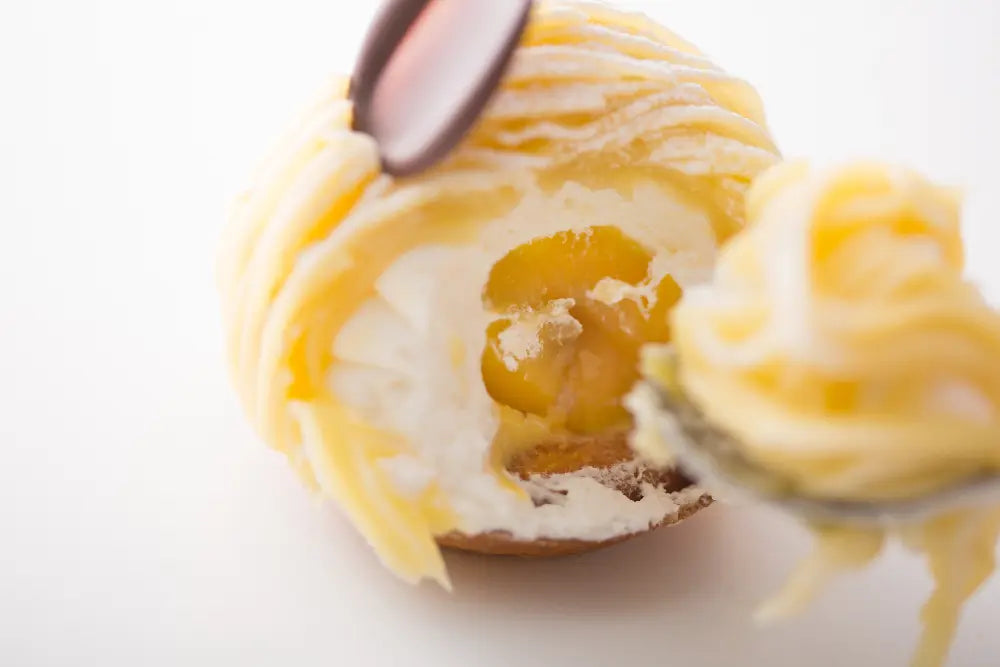 品種の「丹沢」は実の色がきれいなためモンブランの黄金色の美しいフォルムを生み出します。一口食べた瞬間に栗の風味と滑らかな口溶け、マロンペーストと中の生クリームの相性が抜群。旬の時期しか食べれない希少なモンブランをぜひお試しください。